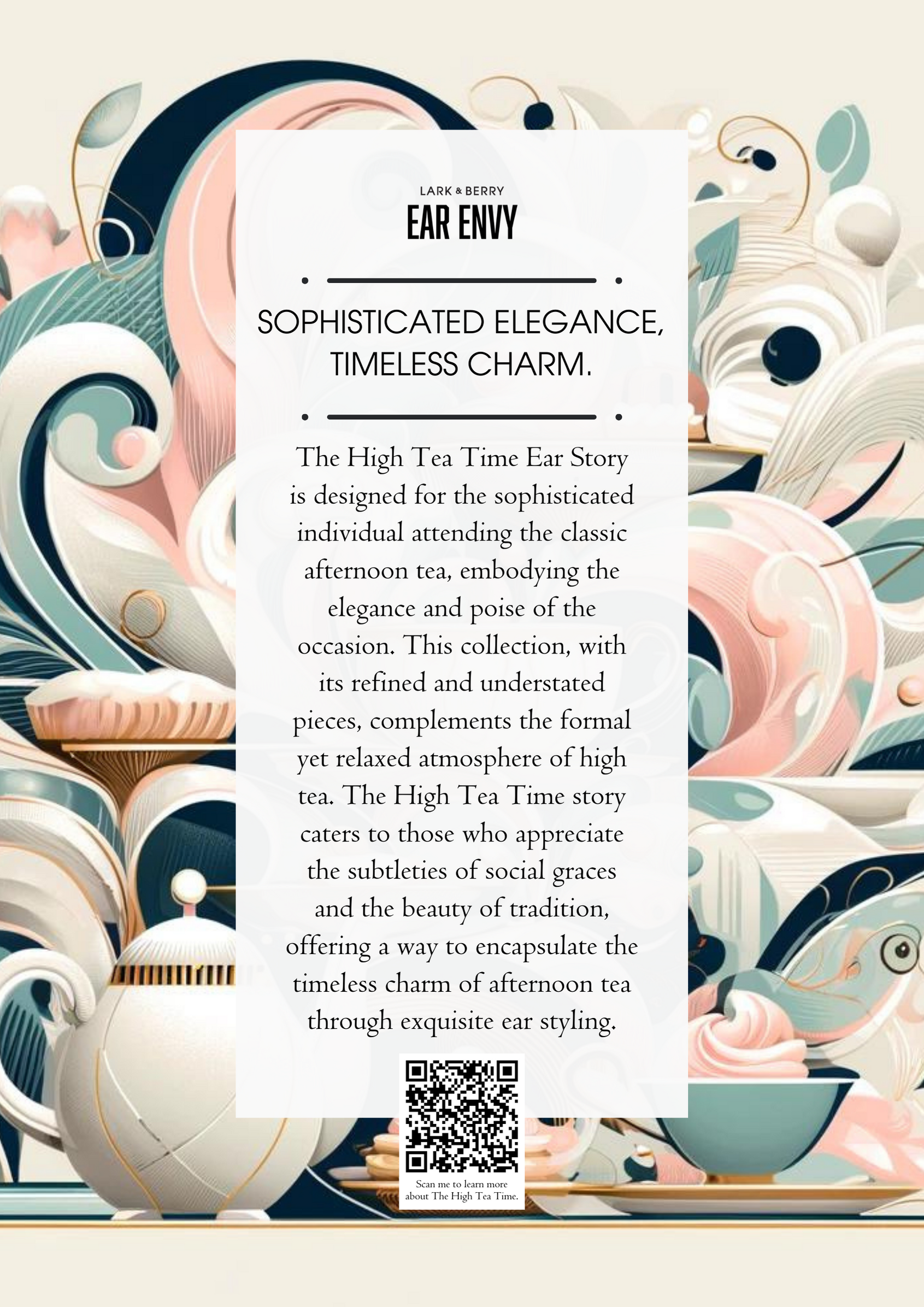 The High Tea Time Ear Story is designed for the sophisticated individual attending the classic afternoon tea, embodying the elegance and poise of the occasion. This collection, with its refined and understated pieces, complements the formal yet relaxed atmosphere of high tea. The High Tea Time story caters to those who appreciate the subtleties of social graces and the beauty of tradition, offering a way to encapsulate the timeless charm of afternoon tea through exquisite ear styling.