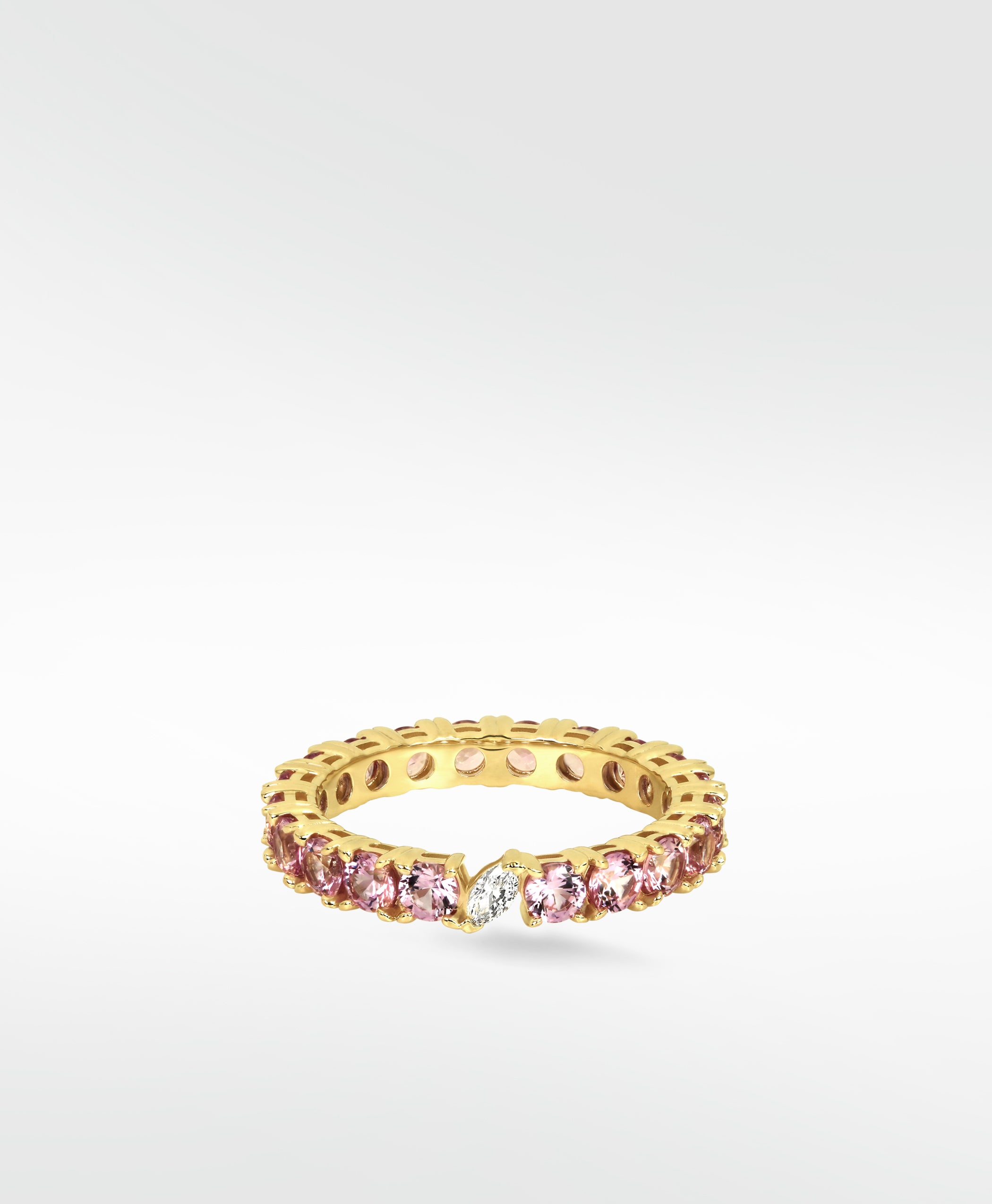 • Delicate pink sapphires encircle this eternity band, crowned with a marquise-cut diamond accent—an effortlessly stackable piece with enduring beauty and charm.