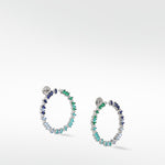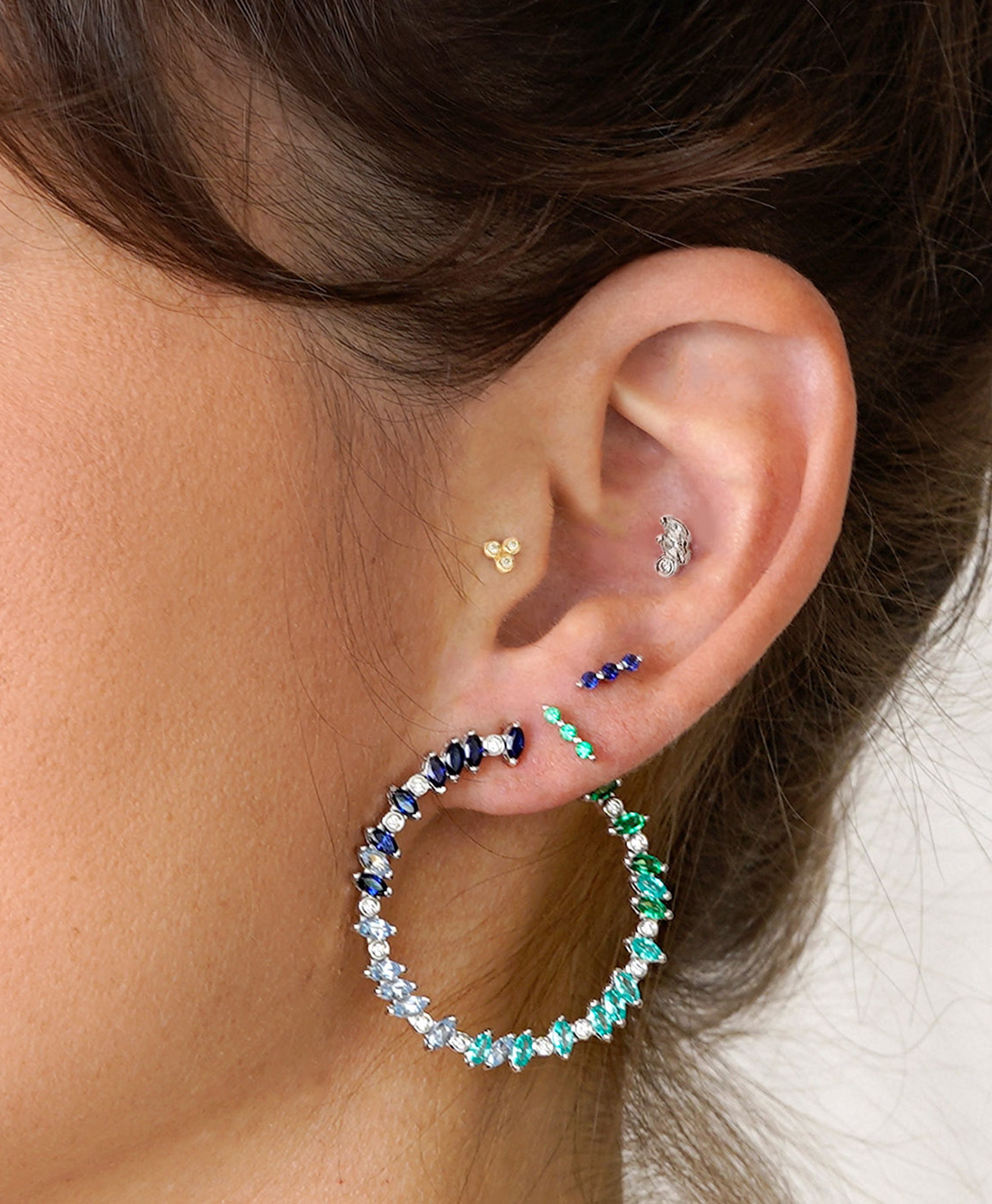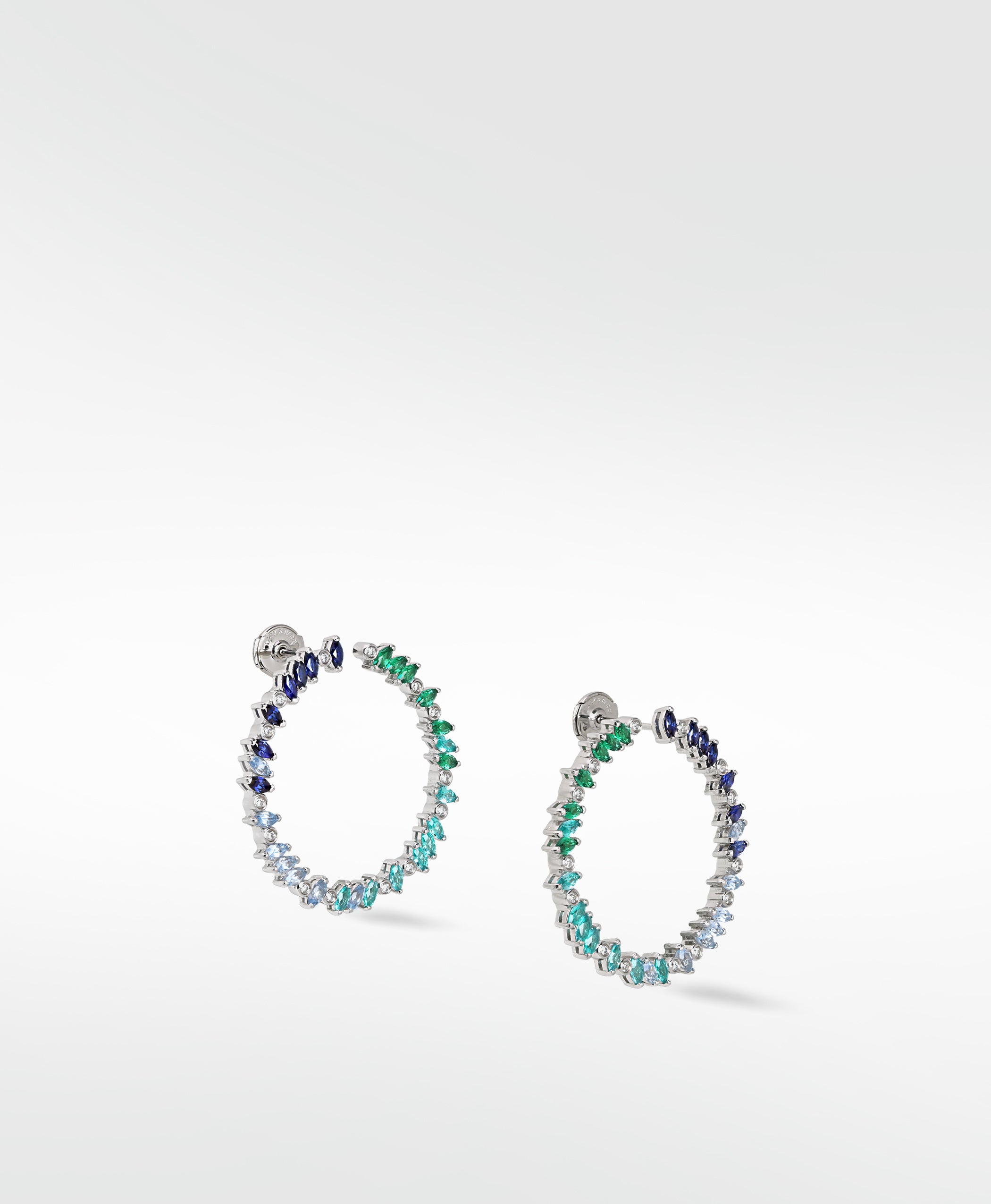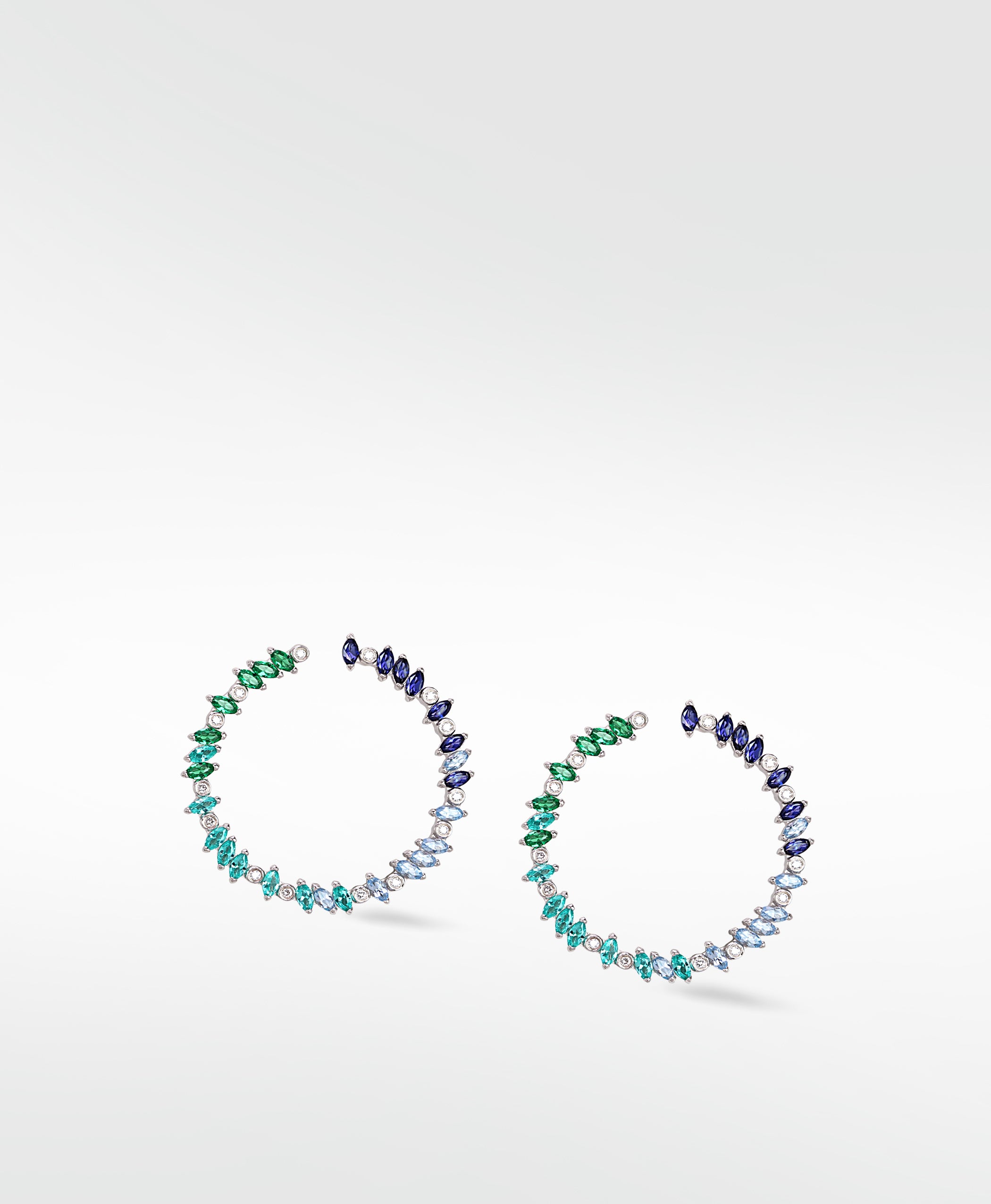 Our Veto Bright Sapphire, Spinel, Emerald and Diamond hoops will take you on a sparkling journey through perfect clear waters and into the lush green of the tropics. This ombré of coloured gemstones, encapsulating a visually arresting, stylish shift from Blue Sapphire to Emerald Green with turquoise shades are the perfect answer to making your outfit pop - and the added twinkling of perfectly cultured diamonds in-between are like dots on the exclamation points of these exciting statement earrings.
